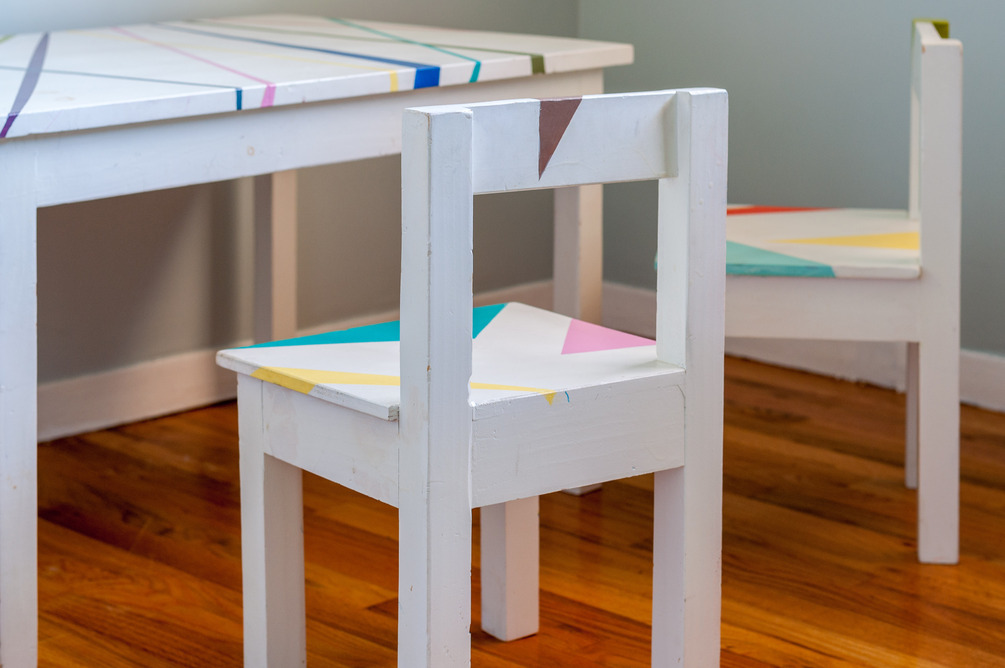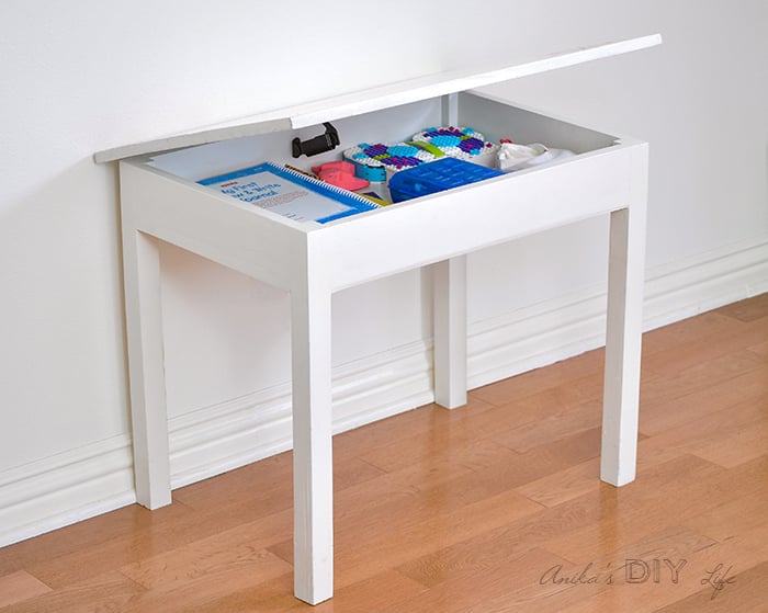 This is a digital 16-page PDF download featuring step-by-step building plans for the Kids table with hidden storage and a chair to go with it.